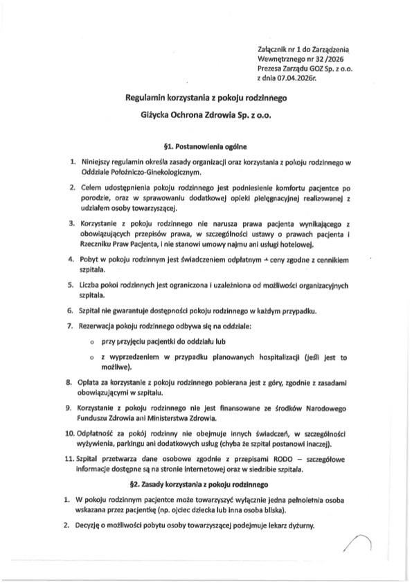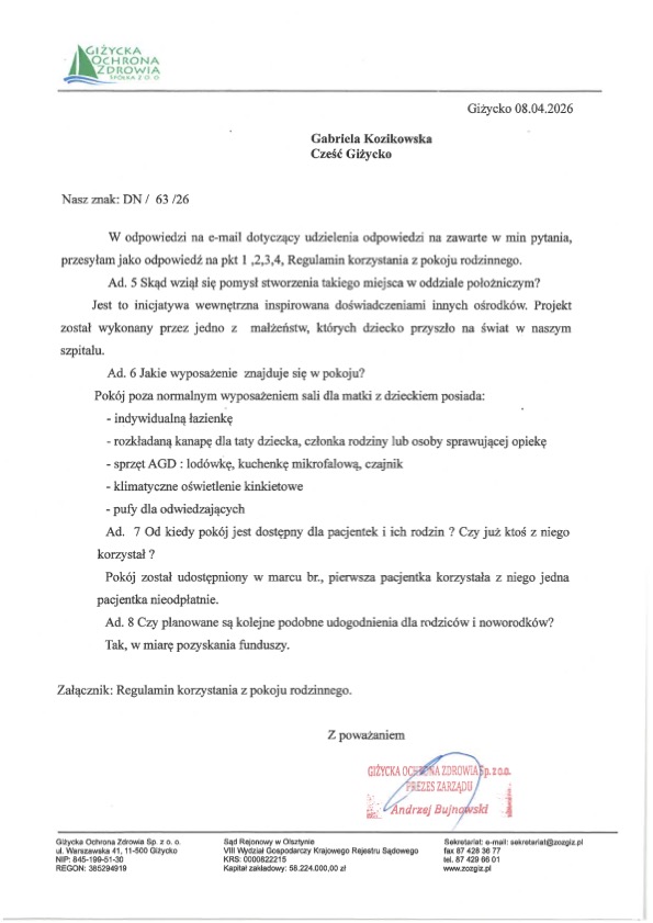 Tekst powstał na podstawie odpowiedzi przekazanej wraz z regulaminem oraz na podstawie cennika (obowiązuje od 03.04.2026 r.). Dziękujemy szpitalowi w Giżycku za udzielenie informacji i przekazanie dokumentów dotyczących funkcjonowania pokoju rodzinnego.