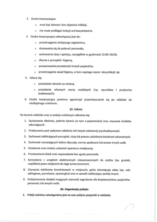 Regulamin wskazuje jasno: pacjentce może towarzyszyć tylko jedna pełnoletnia osoba, wskazana przez pacjentkę (np. ojciec dziecka lub inna bliska osoba). Decyzję o możliwości pobytu osoby towarzyszącej podejmuje lekarz dyżurny.